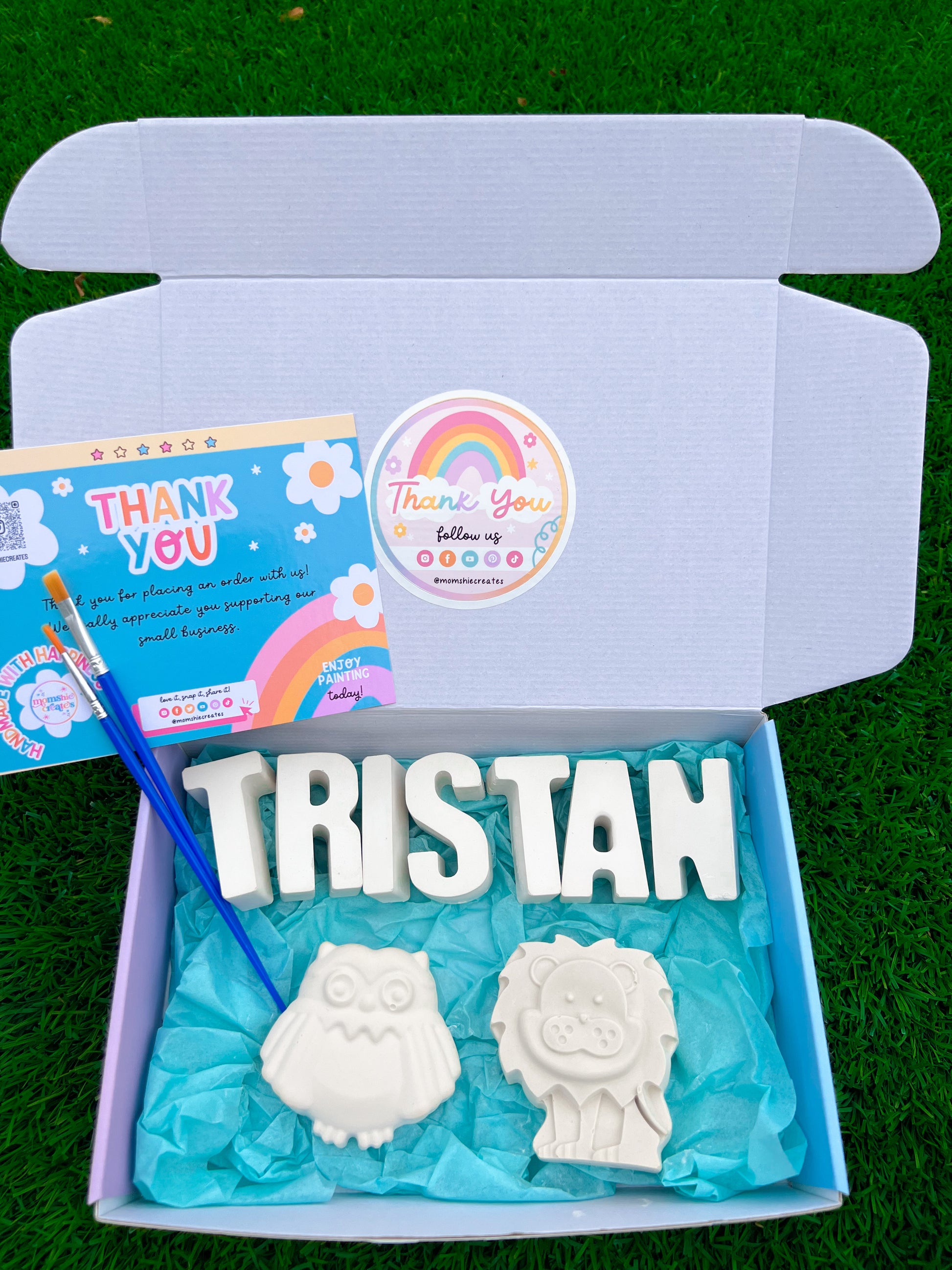 Each kit includes a personalized name mold and 2–4 character molds, providing an engaging, screen-free activity where children can paint, create, and explore their creativity. Perfect for boys who love adventure, color, and hands-on fun, this craft kit also encourages fine motor skills, focus, and artistic confidence.