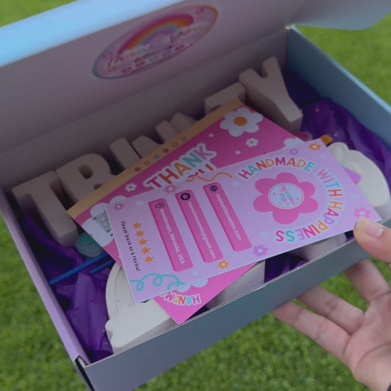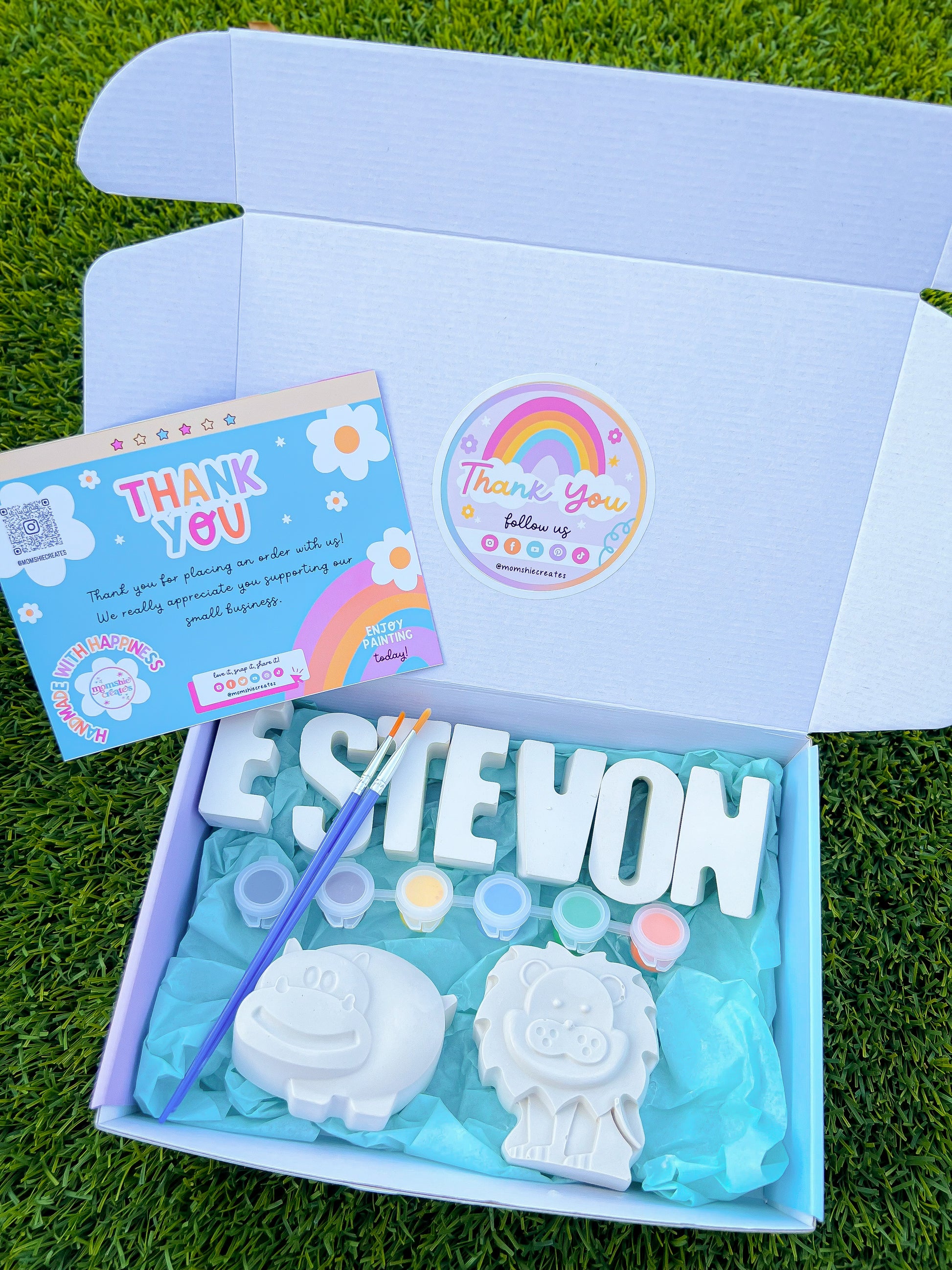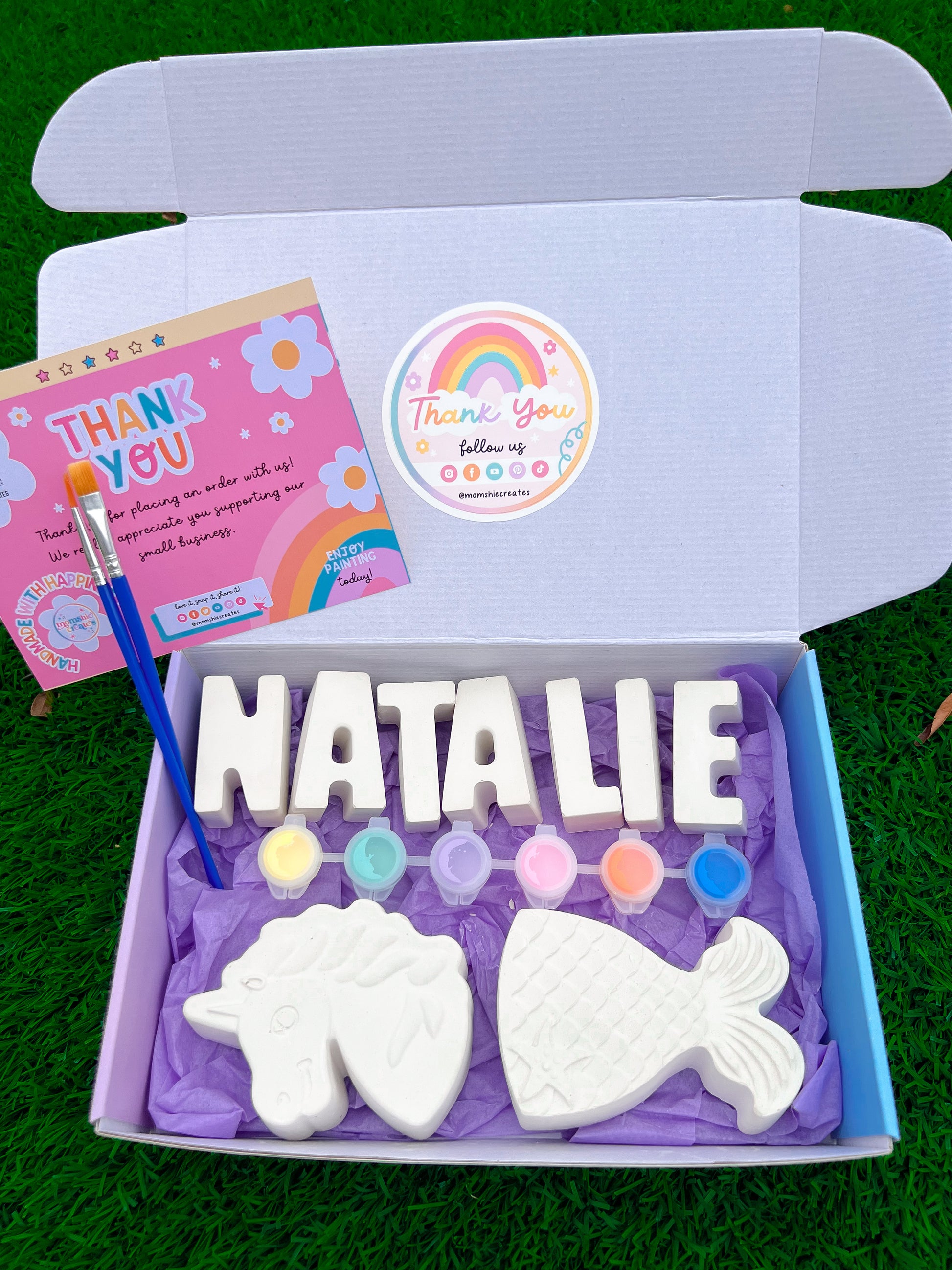 Each kit includes a handmade, personalized name mold plus everything she needs to paint, decorate, and proudly display her one-of-a-kind masterpiece. Thoughtfully crafted and kid-approved, this set is perfect for birthdays, playdates, classroom activities, party favors, or creative family time.
